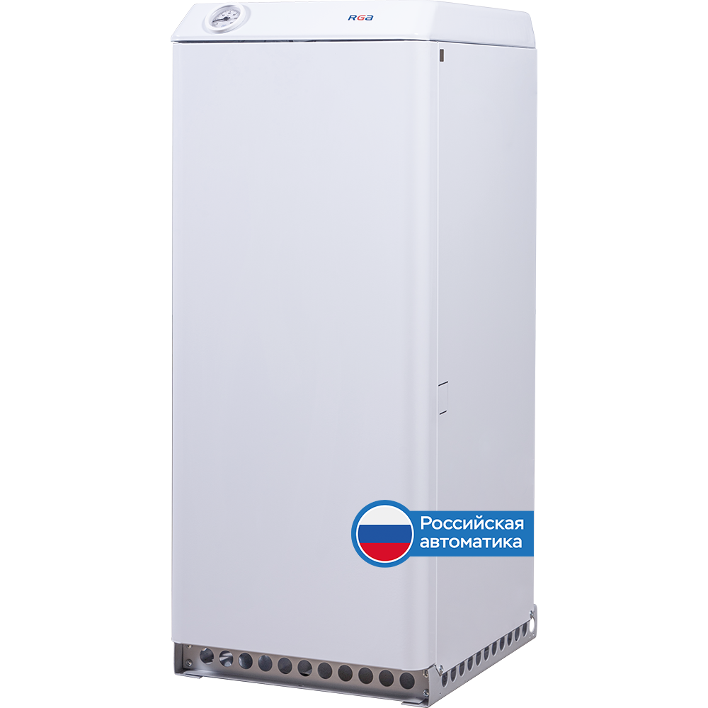 Одноконтурный газовый отопительный аппарат RGA от производителя с отечественной автоматикой. Аппарат предназначен для отопления домов площадью до 125 м2. Цилиндрический теплообменник изготовлен из качественной углеродистой конструкционной стали.